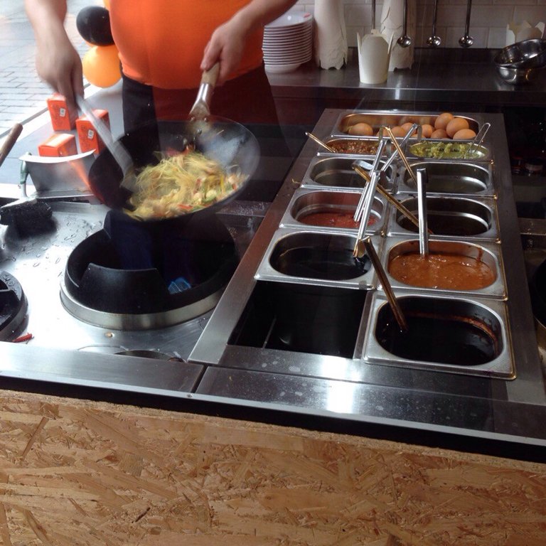 Пахнёт здесь и правда очень вкусно. Лёгкий аромат соевого соуса смешивается с запахом свежих фруктов и нежного мяса. А остановить человека на улице этот аромат может, так как прямо возле главной витрины кафе, расположилась открытая кухня, где опытный шеф заставляет рис с креветками скакать от радости. А зрителей-обычных прохожих, скакать от переизбытка слюны!